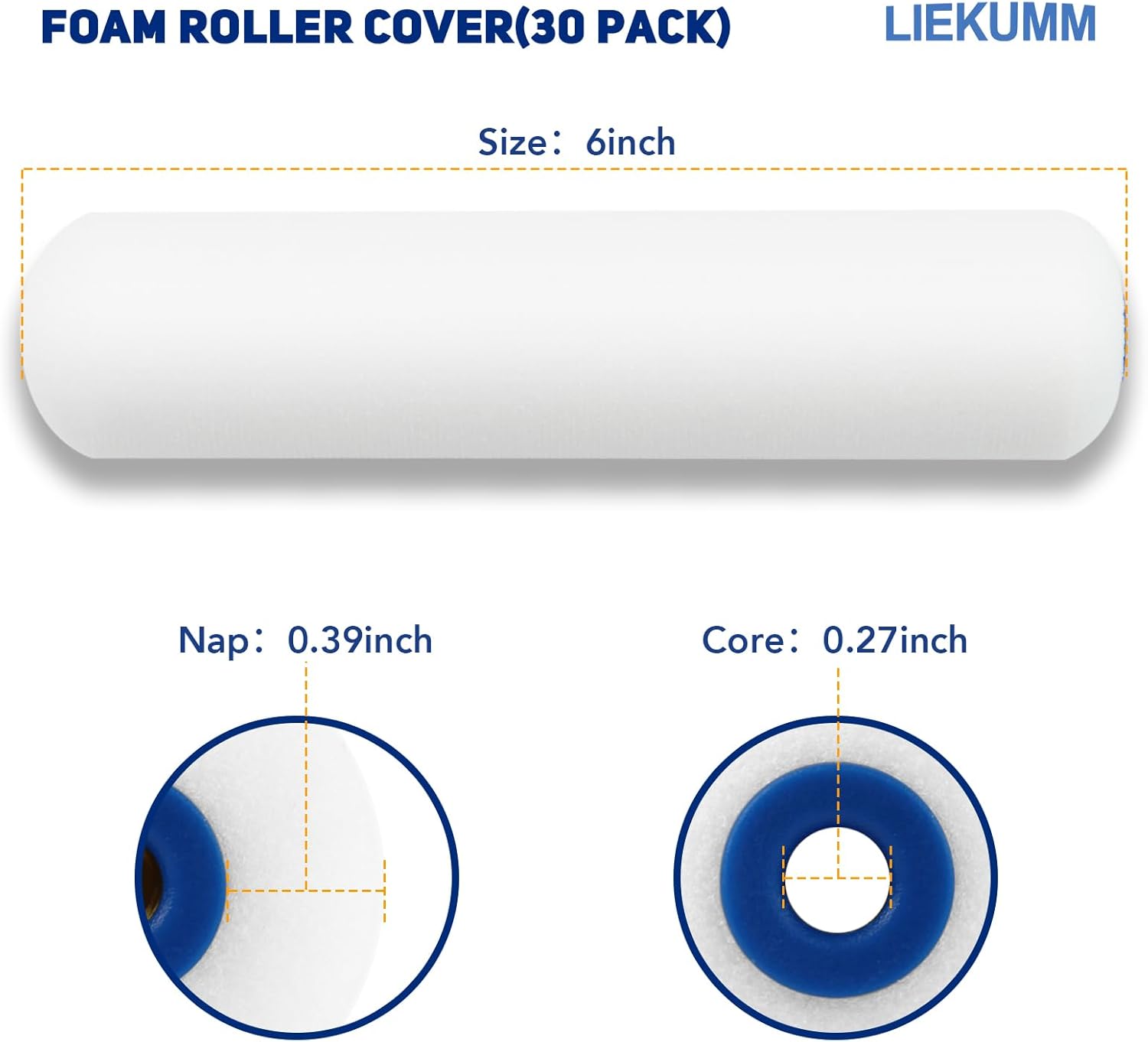 LIEKUMM Foam Paint Curler Covers, 6 Inch Foam Paint Curler, Excessive-Density Foam Curler Refills Portray, Sponge Paint Curler, Appropriate for Partitions, Cupboards, Cabinets, Doorways, Pack of 30