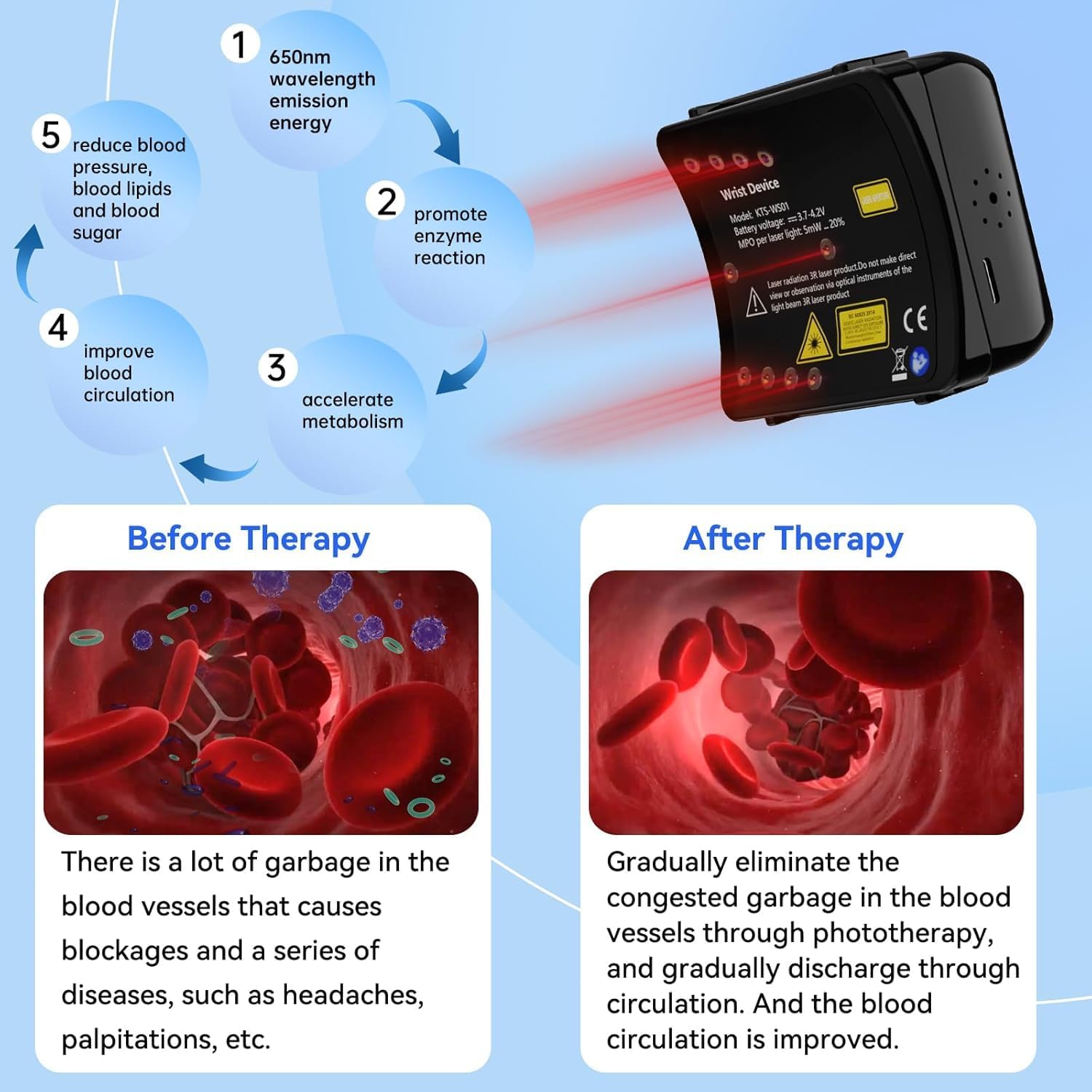 【Superior Know-how】Our watch equipment makes use of 650nm to irradiate blood vessels and acupoints, prompts the exercise of assorted enzymes within the cells via photochemical reactions, and improves the oxygen-carrying capability of pink blood cells, thereby decreasing blood viscosity and blood strain.