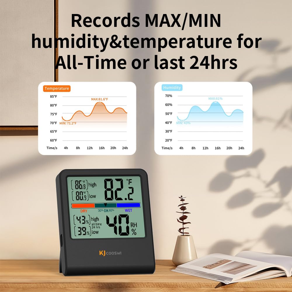 Max/Min Report: Hygrometer shows most and minimal information for the previous 24 hours, immediately figuring out modifications in temperature and humidity so you’ll be able to keep a snug environment.