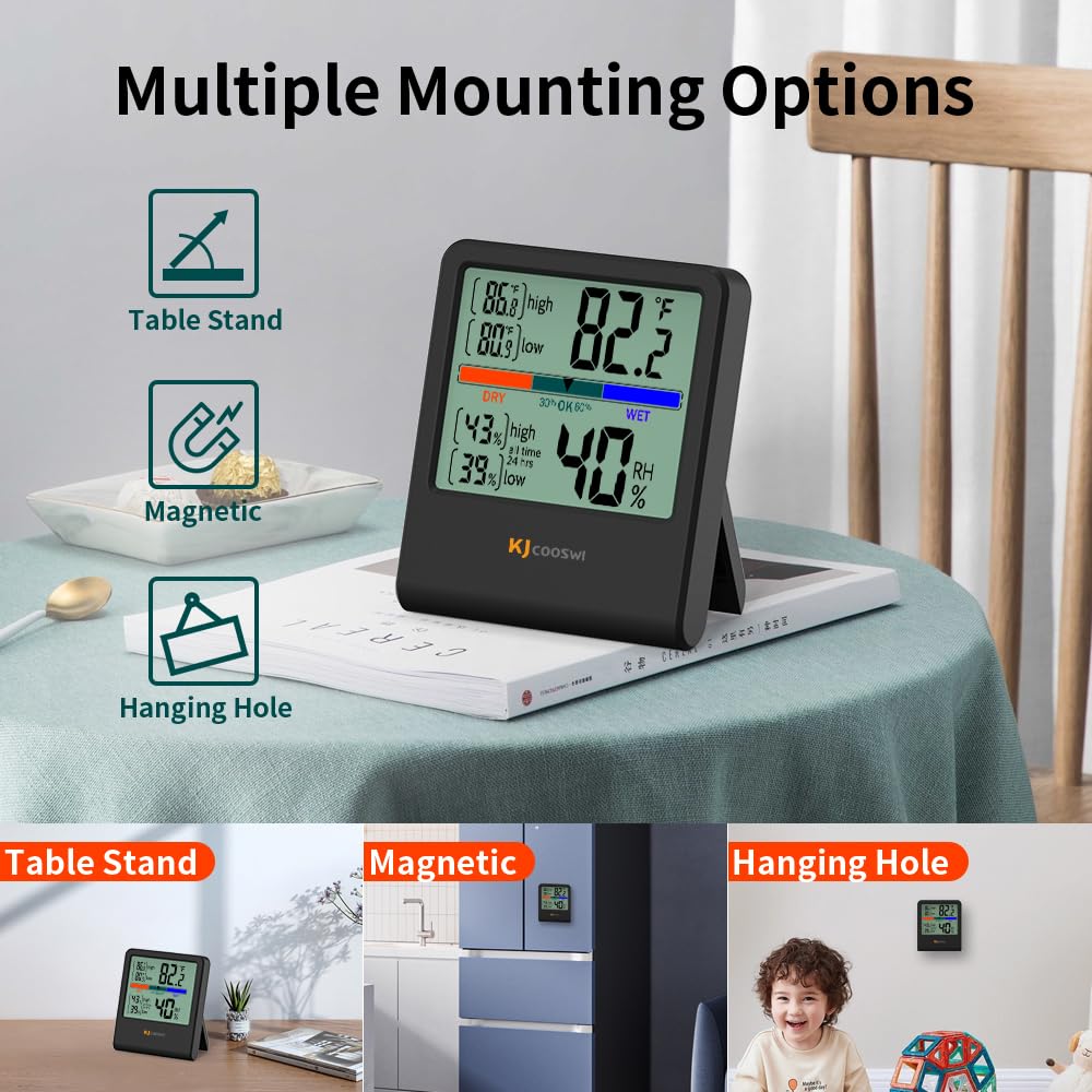 A number of Choices: The house temperature monitor may be held on a wall, positioned on a desk, or connected to a steel floor with magnets; straightforward to see and function, blends completely into dwelling decor.