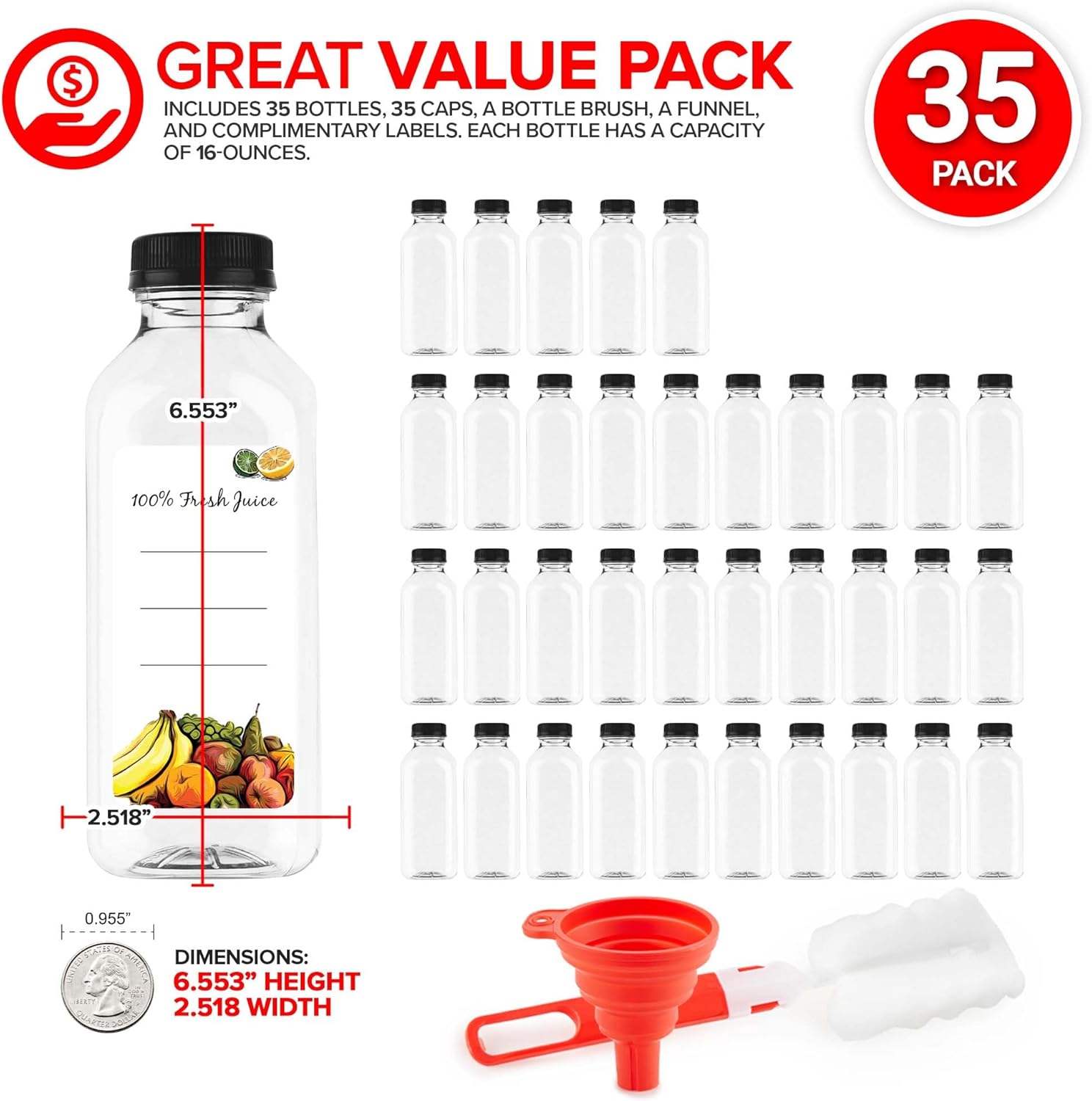 Juice Bottles with Caps for Juicing & Smoothies, Reusable Clear Empty Plastic Bottles with Caps, 16 Ounce Drink Containers for Mini Fridge, Juicer Pictures, Small Water Bottles Bulk 16 oz (35 Pack)