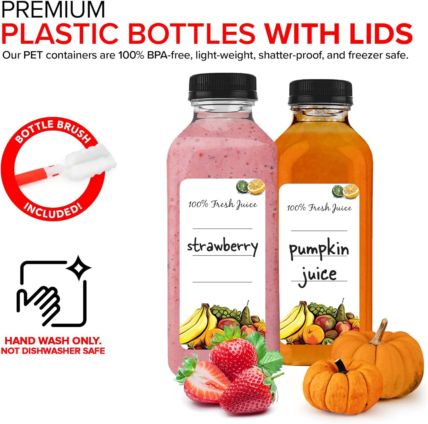 16oz Plastic Bottles with Caps: Our PET smoothie prep containers are 100% BPA-free. In contrast to glass, our bottle is lightweight, shatter-proof, and freezer secure. We advocate throwing out our disposable bottles after use. When you plan to reuse our beverage containers, hand-wash nicely with heat water, cleaning soap, and a sponge brush. Our small bottles for drinks aren’t dishwasher secure.