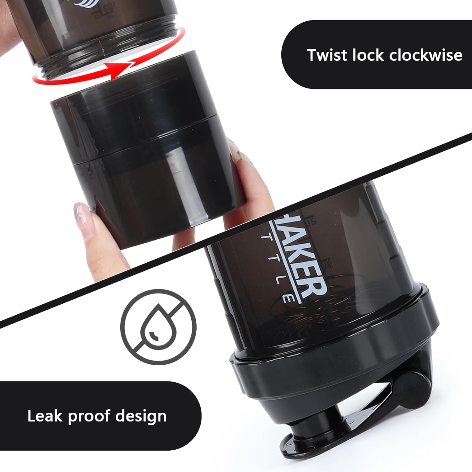 Protein Shaker Bottle,Sports activities Water Bottle,Leak Proof Shake Bottle For Protein Mixer- Non Slip 3 Layer Twist Off 3oz Cups with Tablet Tray – Protein Powder 16 oz Shake Cup with Storage,Black