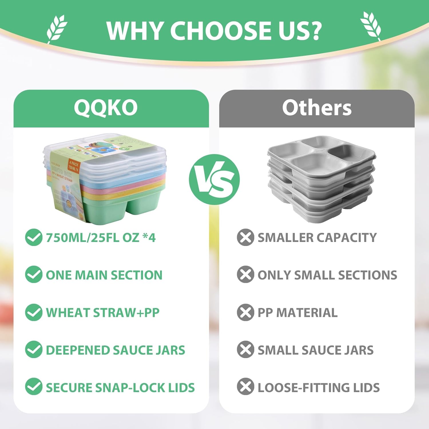 4-Pack Bento Snack Bins: Add coloration to your meal prep with our 4-pack bento containers in delicate pastel hues. Every container holds 750ml (25oz) and options 3+1 compartments, plus 4 bonus sauce containers for dips