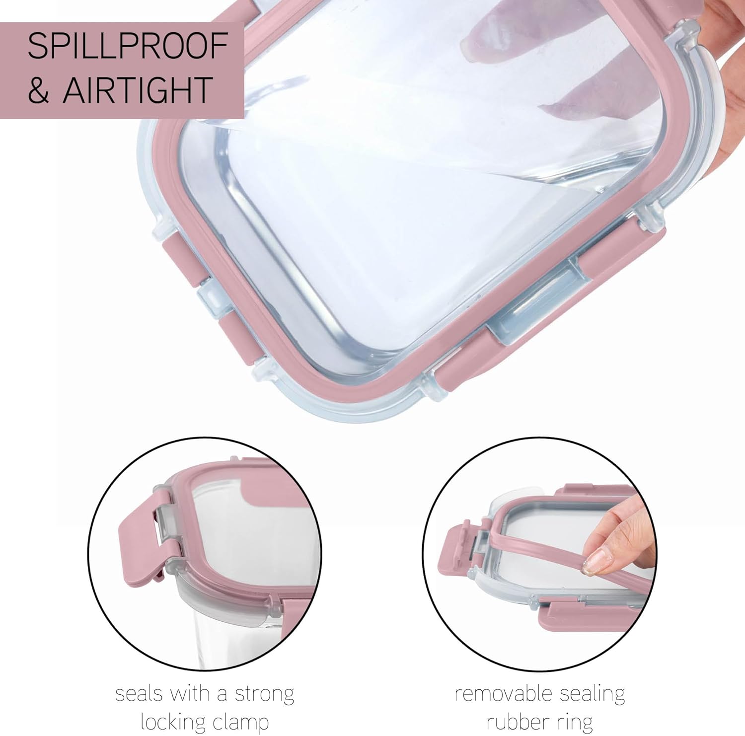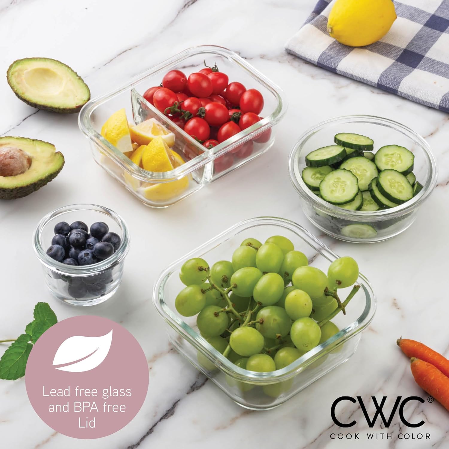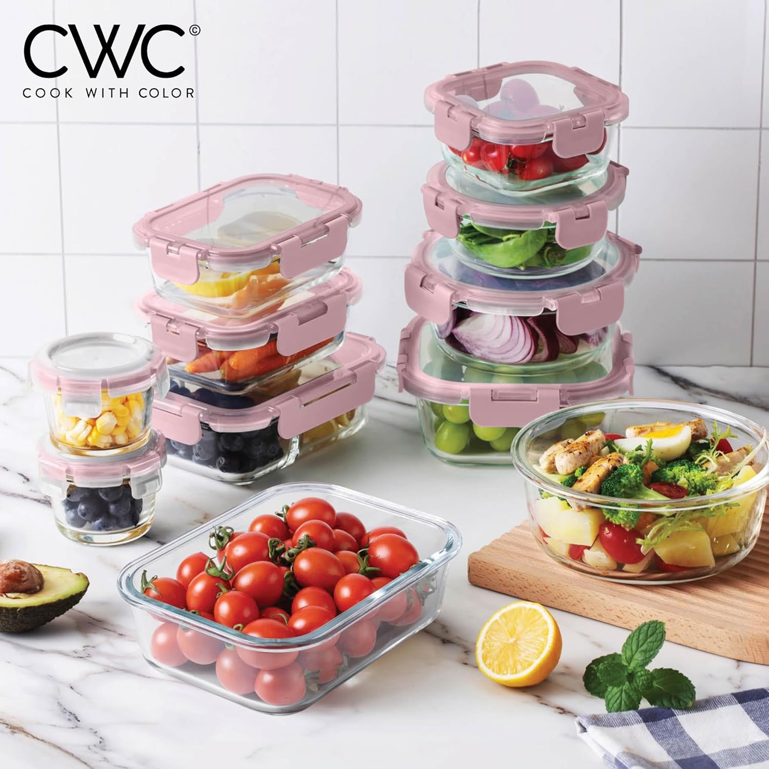 COOK WITH COLOR Premium 32-Laptop. Borosilicate Glass Meals Container Set with Dividers – 4 Rectangles, 8 Rounds, 4 Squares – Leakproof Lids – Meal Prep, Storage, Pink