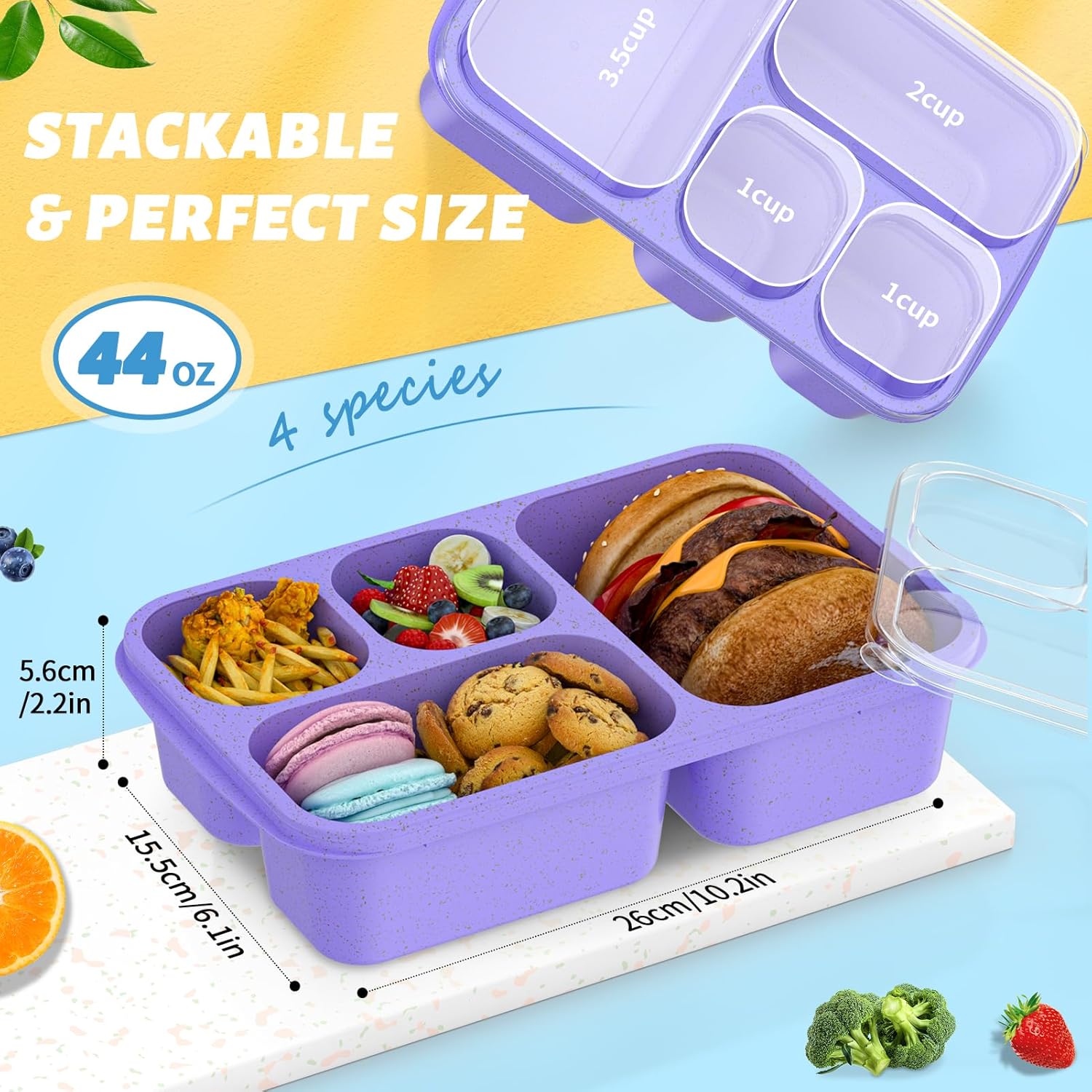 【Giant Capability for Balanced Meals】 With a spacious design and 4 beneficiant compartments, every Bento Field holds as much as 44 fluid ounces, permitting you to pack a well-balanced meal. Whether or not it is sandwiches, salads, fruits, or snacks, you may manage your lunch effortlessly. The scale (10.2×6.1×2.2 inches) matches into most lunch baggage or backpacks, offering the proper portion dimension for adults and youngsters alike. [Perfect for healthy, organized meal prep.]