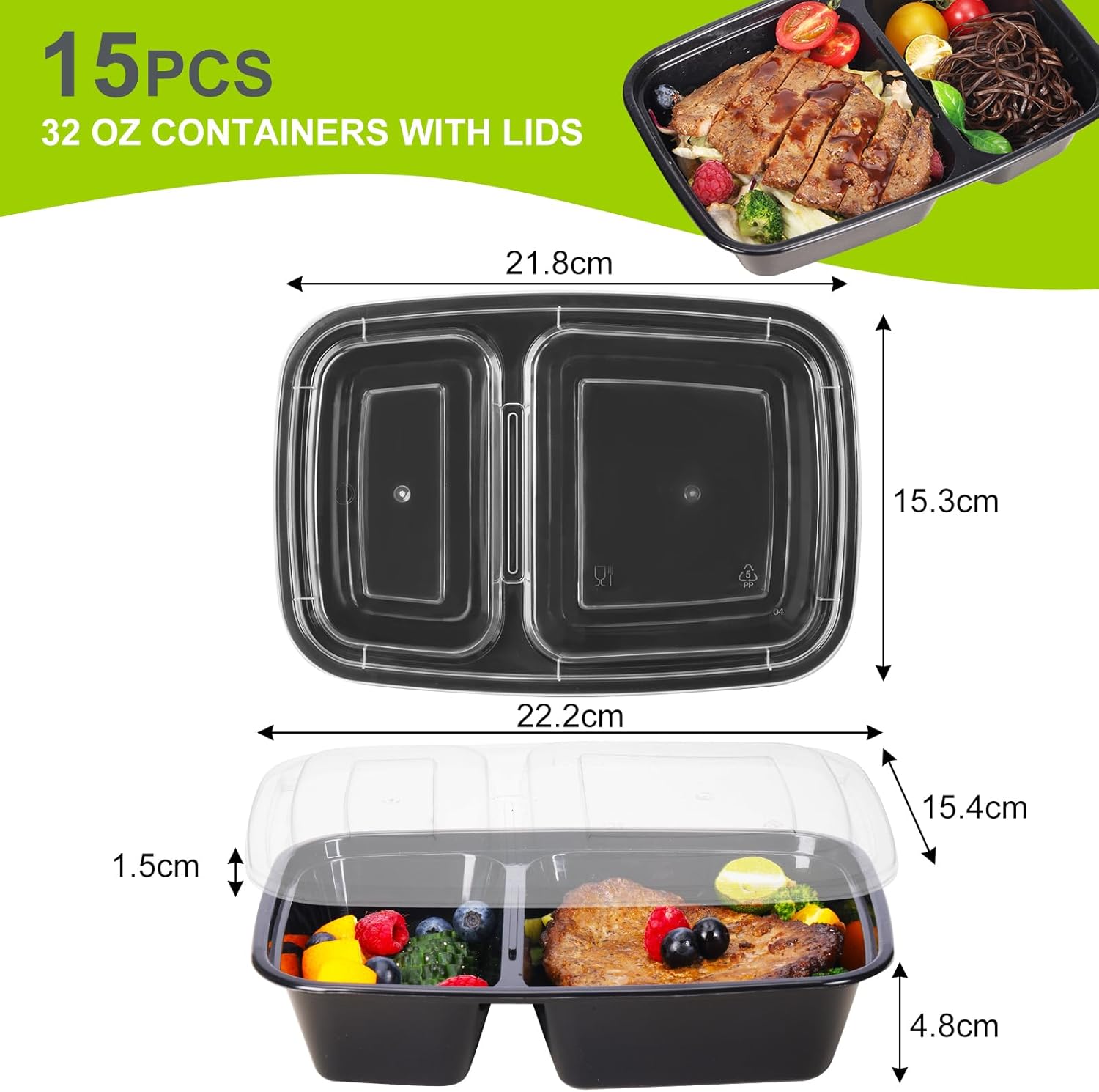Nice Meals Storage Containers: Bundle consists of 15 packs 32oz 2 compartment meal prep containers. The leak proof lids will tightly seal the meals containers for meal prepping, stopping any annoying leaks or spills in your bag or freezer.