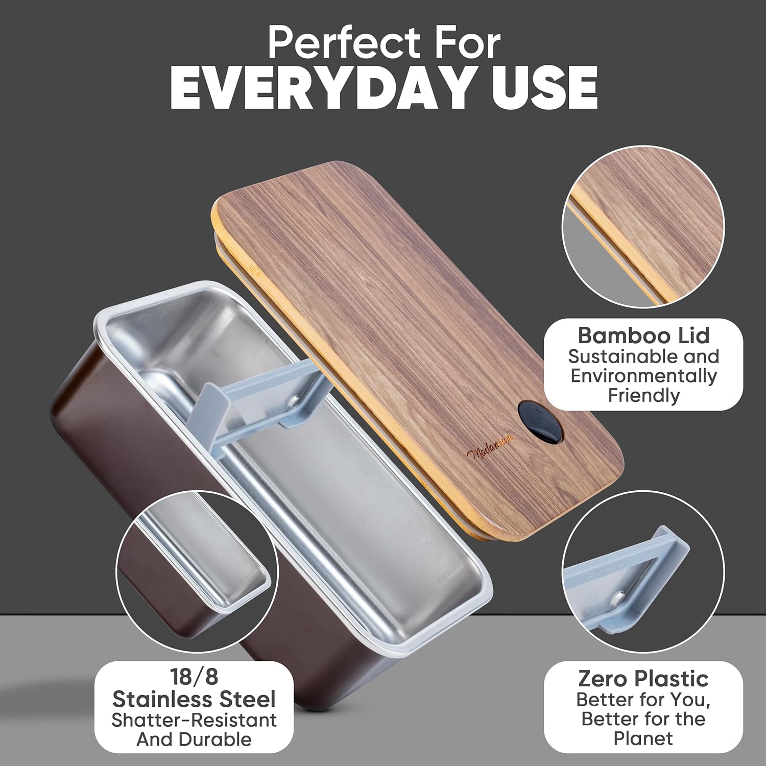 MODANIAM FOOD ON THE GO COLLECTION: This bamboo bento field for adults/ Lunchbox pairs properly with Modaniam Lunch Luggage, Transportable Cutlery, Insulayed jars and different Lunch field and bento field assortment. The Lid has darkish wooden end that pairs with Modaniam Insulated Jars completely.