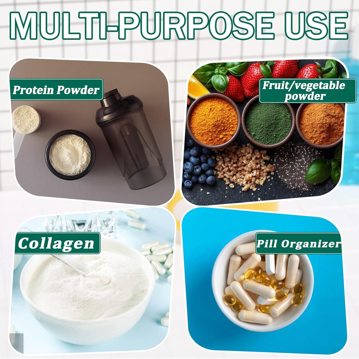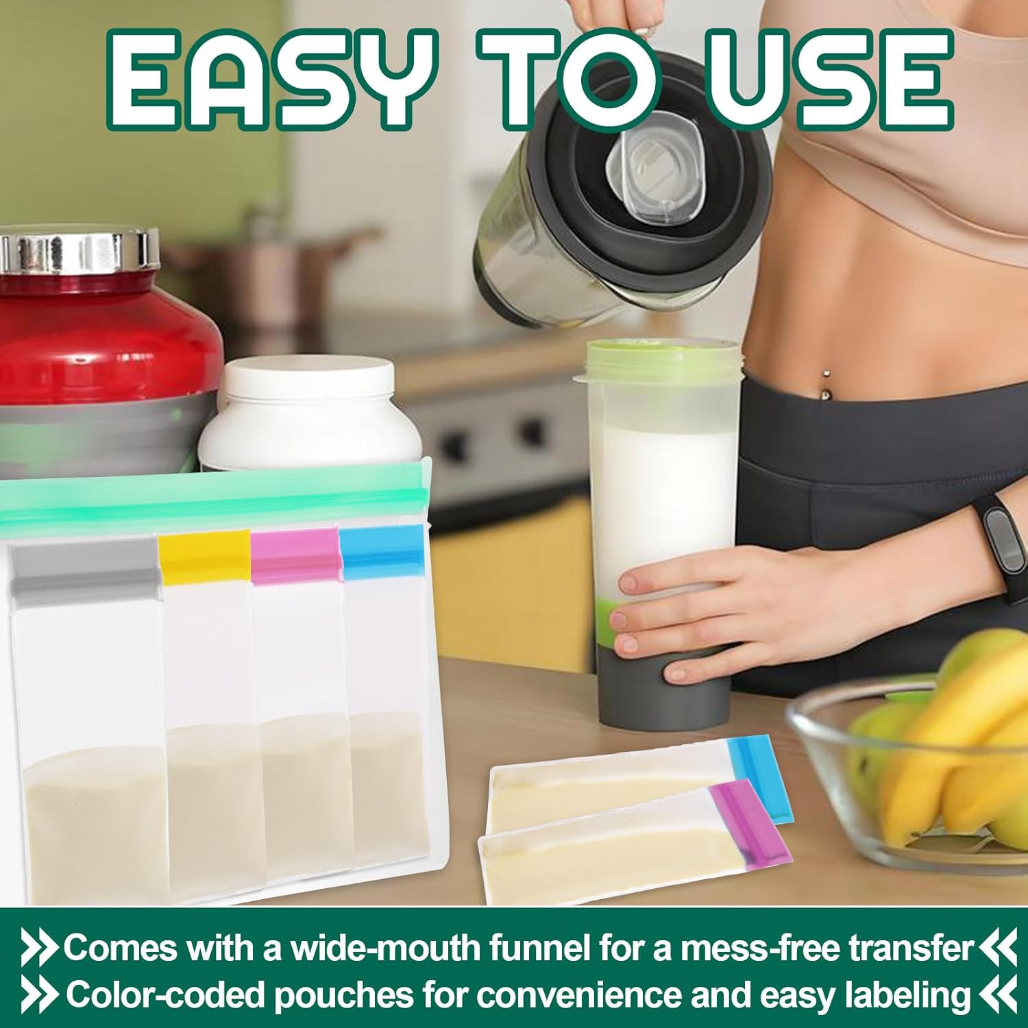 Bundle Contents: This protein powder journey container set contains 3 giant luggage(9.52″x 6.88″) in 3 colours, and 21 single-dose lengthy strip luggage(2.24″x5.55″). It additionally comes with 3 funnels, 3 stickers, and a set of two clear plastic scoops together with 1 white scoop.