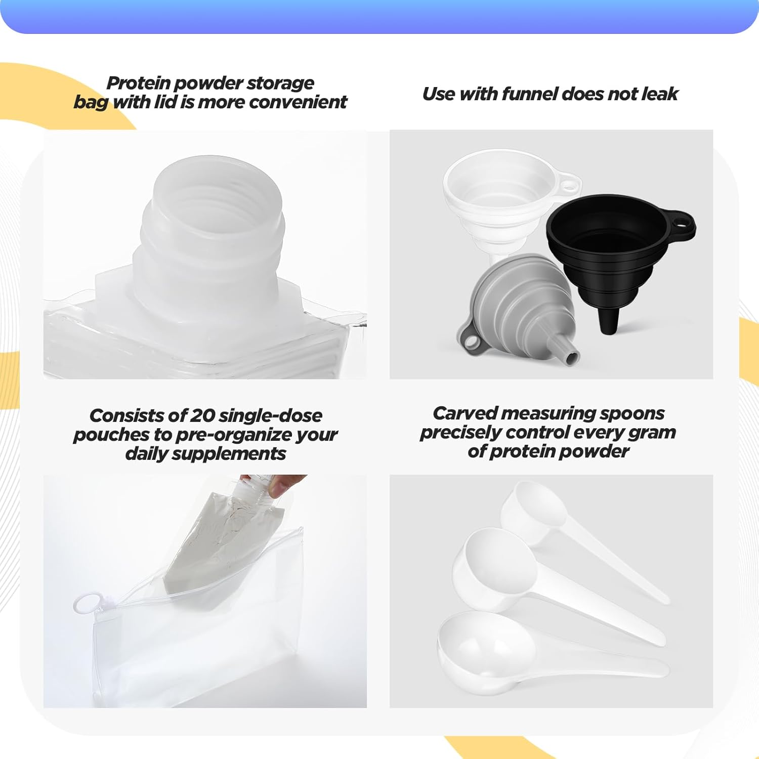 Handy Journey Packs: you’ll obtain 30 protein powder storage luggage(150 ml / 5 oz); 3 massive storage luggage for protein powder storage luggage, 1 every in black, grey, and white silicone funnels; And three measuring spoons, white, 7.5 g, 10 g, and 15 g