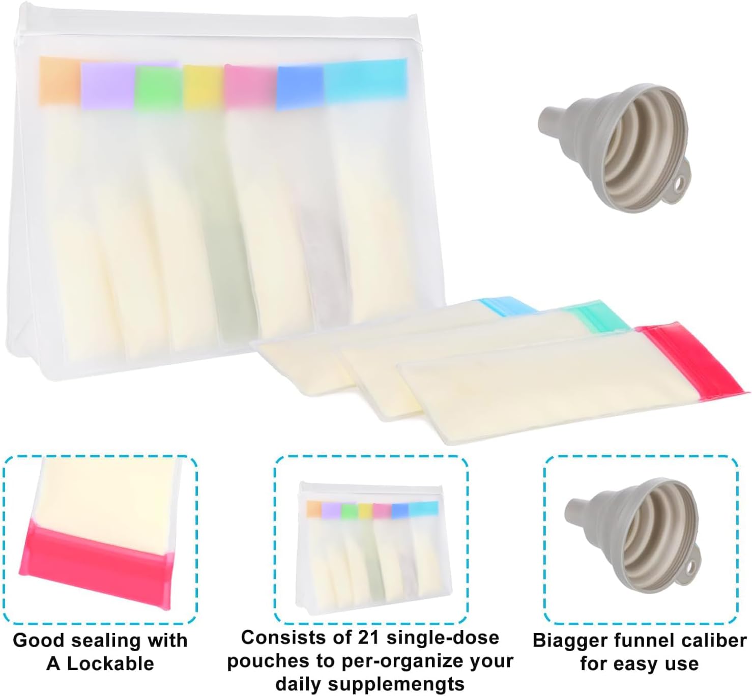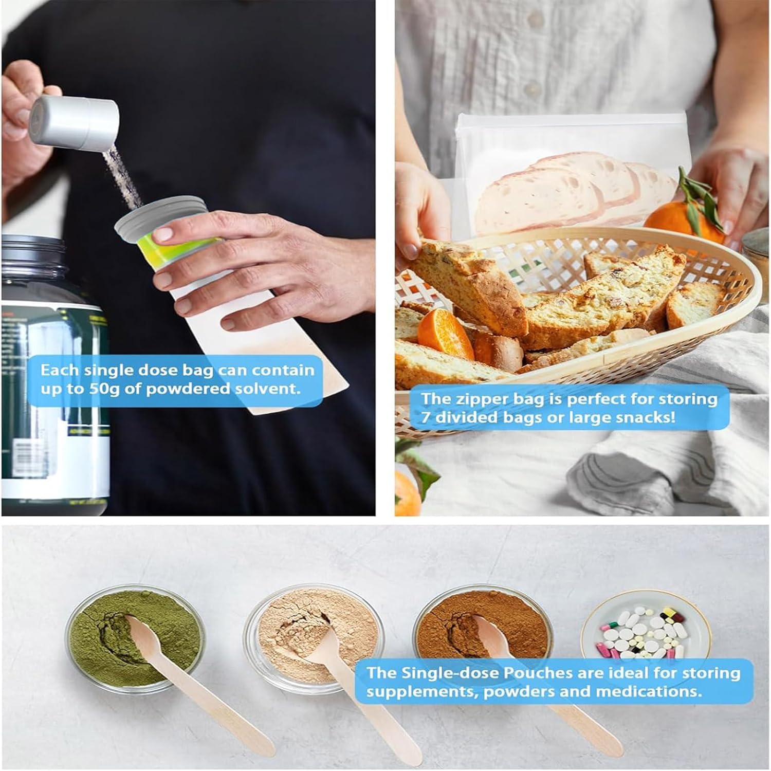 Protein Powder Container Set for Journey, Reusable Powder Container To Go, Consists of 21 Single Dose Luggage, 3 Massive Zip Luggage, Funnels, Drain rack,Measuring spoon,Flawless Providing for Health and Journey