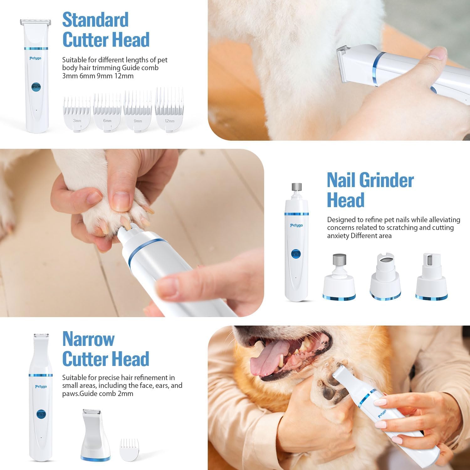 【All-In-One Pet Clipper Package】 – Petygo Pet Trimmer Package comes with 2 interchangeable trimmer heads and 1 nail grinder head, a USB charging cable, and a small brush.perfect for canine, cats, and different furry pets. Excellent for full-body grooming and manicure.