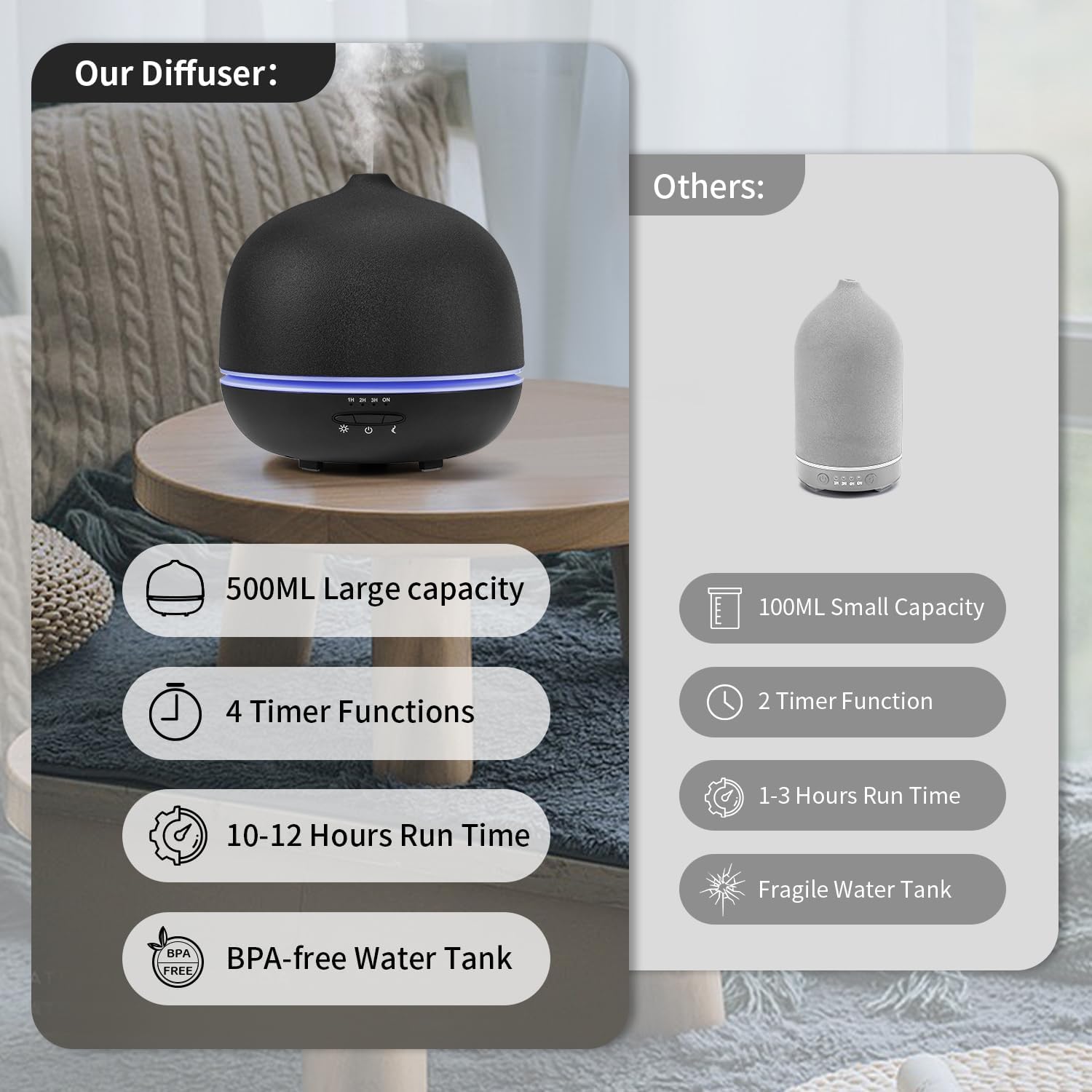 Wanlola 500ml Important Oil Diffuser,Black Massive Ceramic Diffusers,Ultrasonic Cool Mist Humidifier with 4 Timer & 10 Colours Mild for Residence,Present