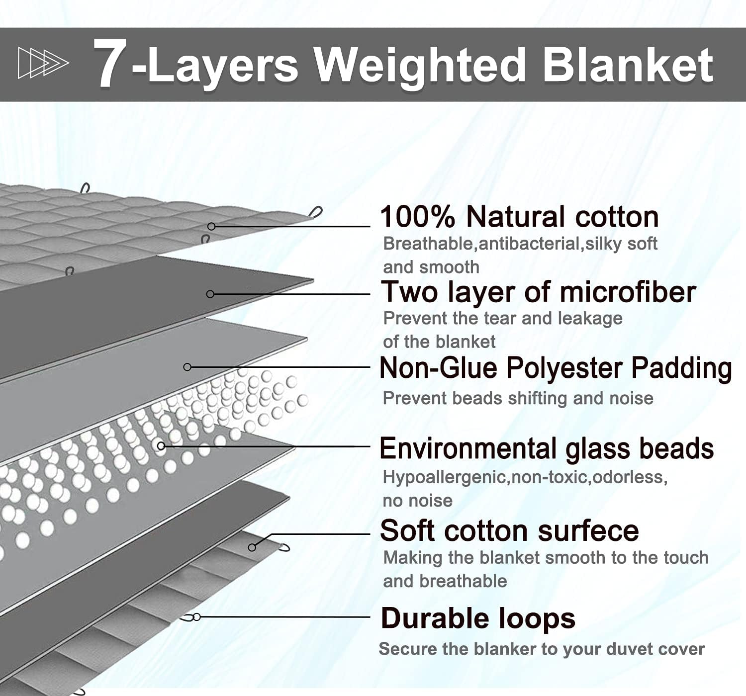 PREMIUM MATERIAL: Consolation is a key ingredient of the weighted heavy blankets. Our blanket is made from 100% Cotton cloth, snug and skin-friendly