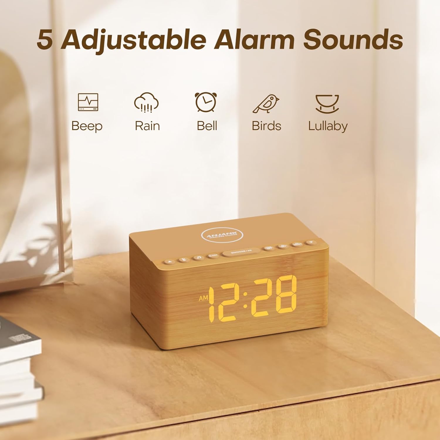 𝐒𝐦𝐚𝐫𝐭 𝐀𝐥𝐚𝐫𝐦 𝐂𝐥𝐨𝐜𝐤: It may auto-sync the cellphone’s time through Bluetooth, and there’s a 12/24H format setting to decide on. 5 alarm ringtones(beep,rain,bell,birds,lullaby) wake you up, and quantity changes from 0 to 100% for selection.