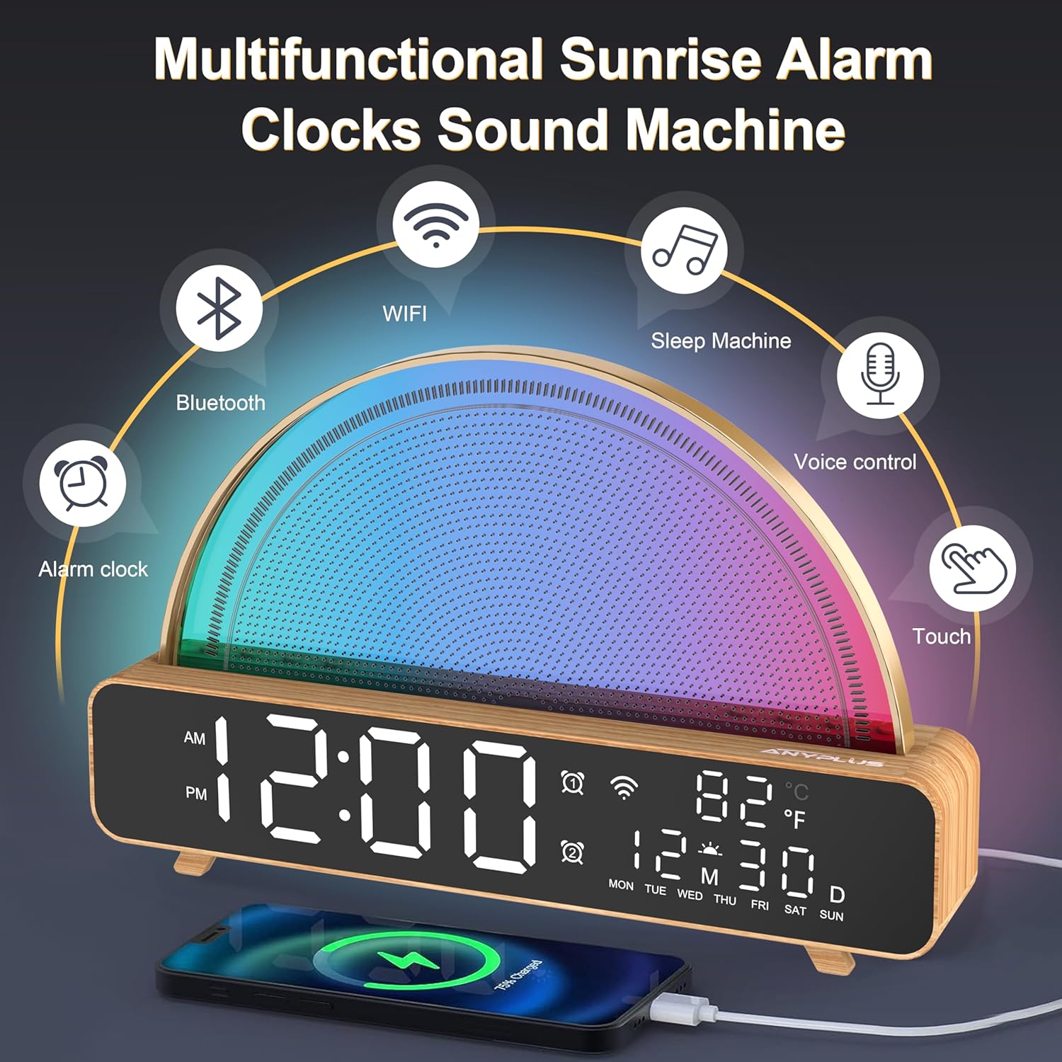 Dawn Alarm Clocks White Noise Sound Machine for Bedrooms, Wooden Grain Base Wake Up Mild Alarm Clock with 13 Soothing Sounds & 8 Shade Night time Lights for Child/Adults/Youngsters(with APP